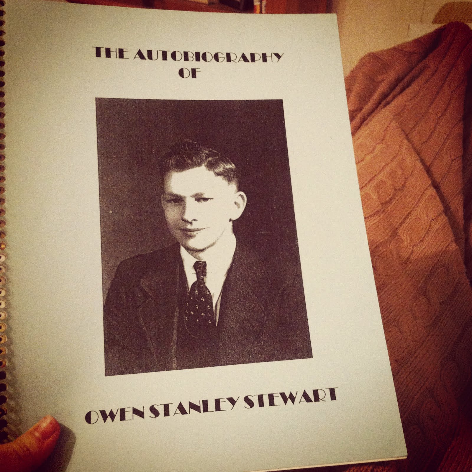 Sunday reading of my Grandpa Stewart's autobiography and a shot of our kitchen "shelving"